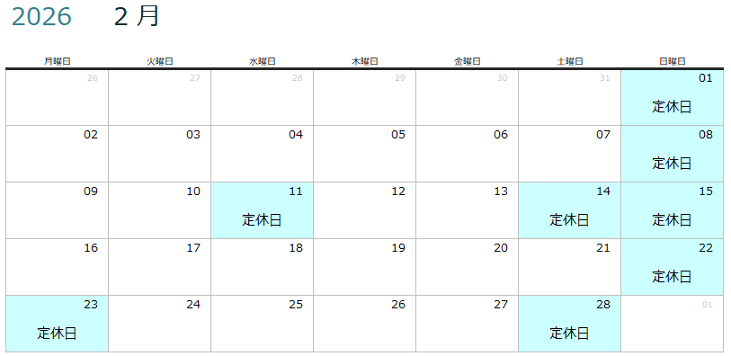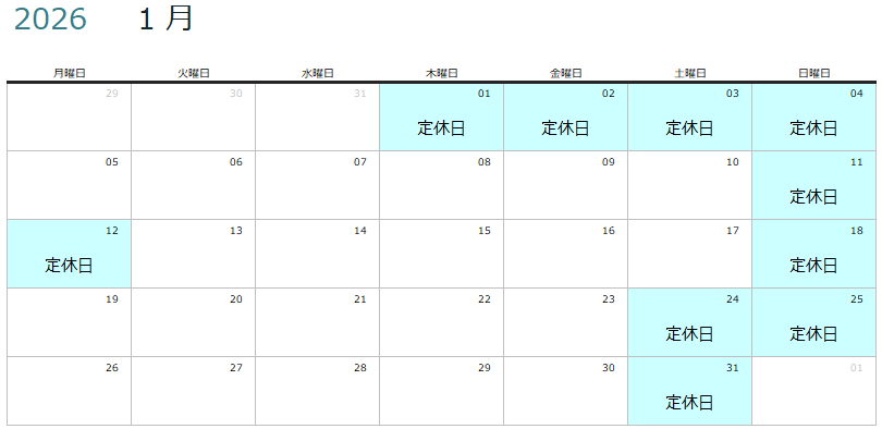 1月、2月の定休日のお知らせです。 受付時間は 9:00~12:00 13:00~19:00となります。 皆様のご来店お待ちしております。